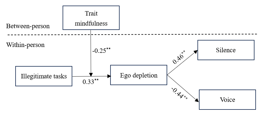 研究发现,每日不合规任务与员工每日沉默行为呈正相关,与员工每日建言行为负相关。员工每日自我损耗在上述关系间起中介作用。特质正念负向调节不合规任务与自我损耗的关系,以及不合规任务对沉默和建言的间接效应。