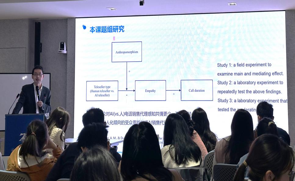 讲座中段教授还分享了自己课题组围绕AI vs.人电话销售的影响效果的研究发现,即在电话销售场景中,受众对AI(vs.人)电话销售代理感知共情更好,更没有耐心,而高拟人化倾向的受众更能共情AI销售代理。展望未来,段教授提出了数字化栖居、终身学习等概念,他指出创造性工作将成为重点,人类的设计思维、共情能力和创造力将与 AI的计算能力优势互补,共同推动社会进步。在这一过程中,人们应保持主动性,积极适应数字时代变化,实现人与 AI在各领域的和谐共生与共同发展。