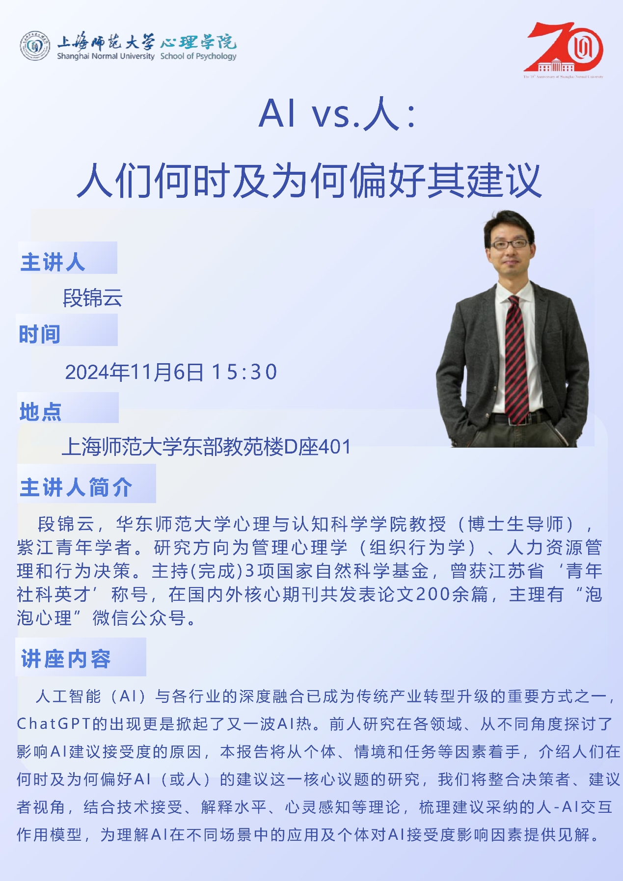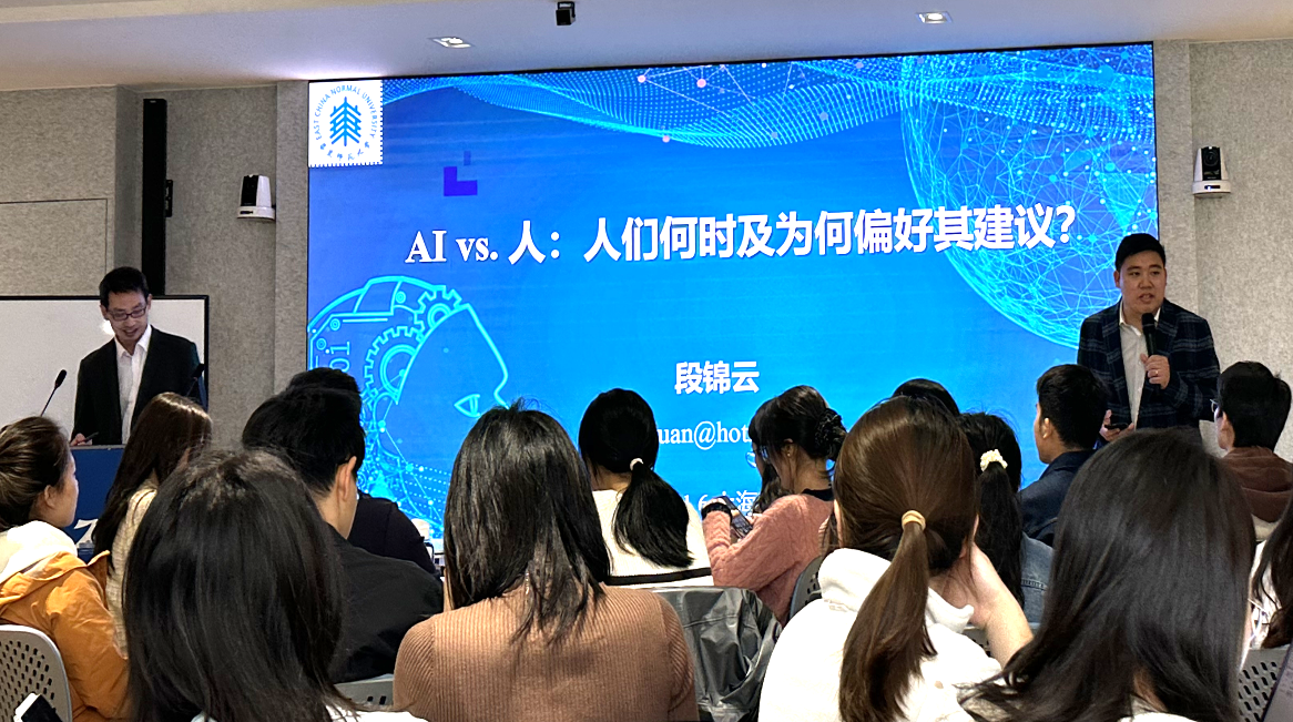 2024年11月6日下午,华东师范大学心理与认知科学学院段锦云教授应邀为我院师生作《AI vs.人:人们何时及为何偏好其建议》的学术报告,报告由心理学院应用心理专业硕士学位点负责人王怀勇副教授主持,学院七十多名师生参与此次交流。