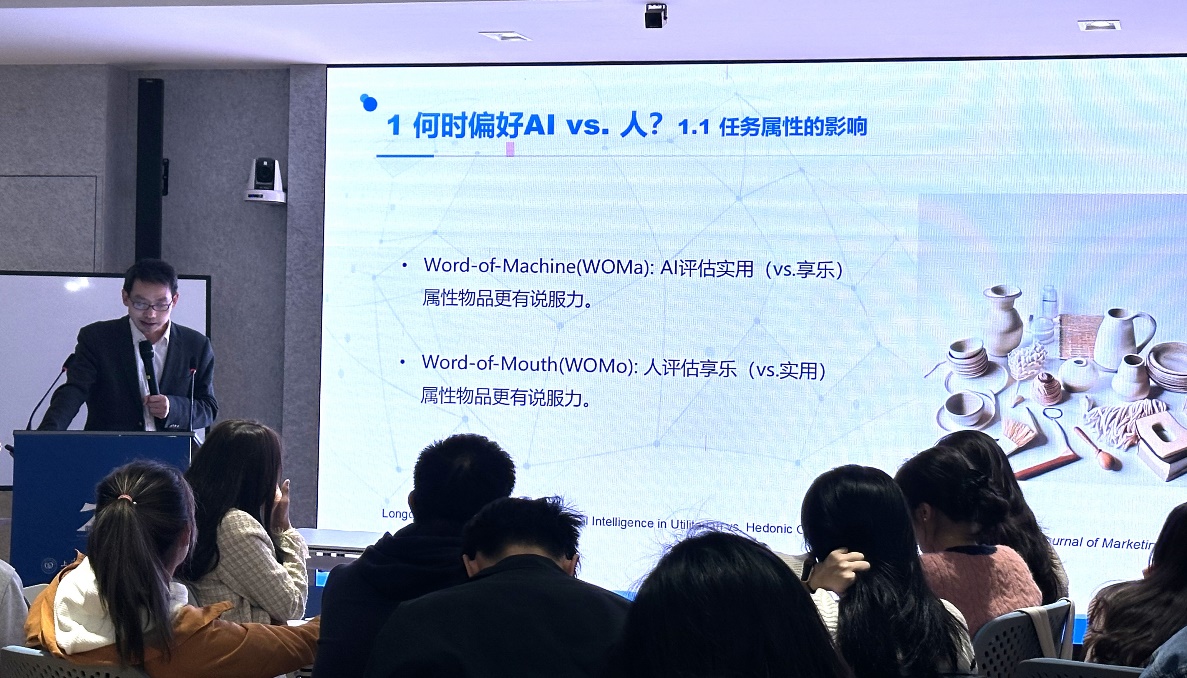 讲座伊始,段教授从GPT系列模型的演进到AI在国家战略层面的重要意义系统梳理了AI的发展脉络。接着,他针对“何时偏好AI vs.人”详细分析了任务属性、建议接受者、建议提出者及建议形式/内容等因素如何影响人们的偏好选择;在“为何偏好AI vs.人”部分,段教授引入了心理感知理论、技术接受模型、解释水平理论和预测加工理论等多维度理论,在具体阐述的基础上深入揭示了人们判断AI建议的内在逻辑。