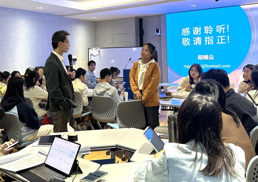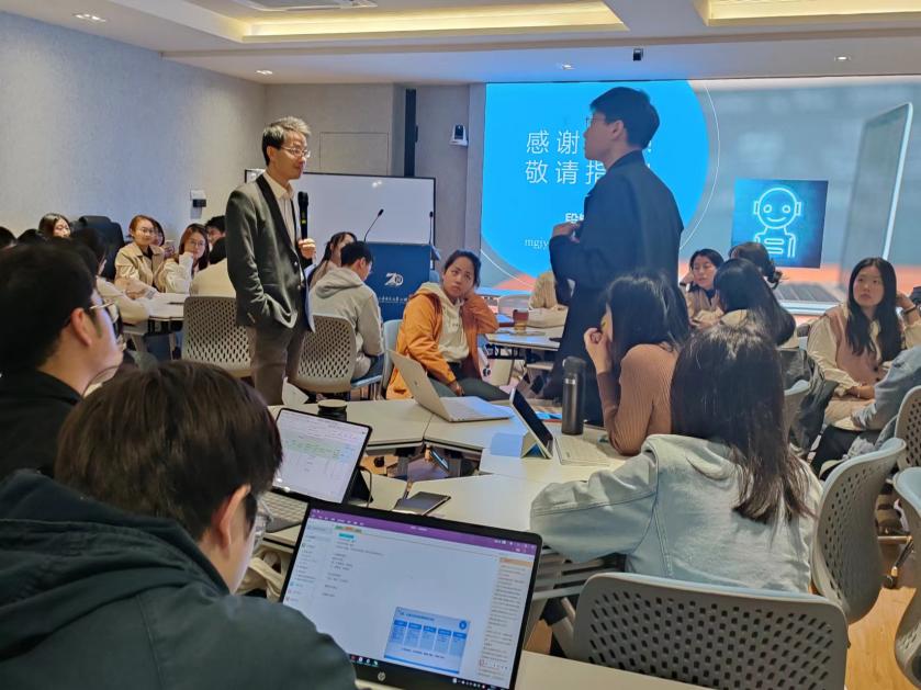 在互动环节,同学们积极提问,问题涵盖了AI在不同管理实践领域的应用、AI决策的公正性、数字化心力、人类与AI的未来关系等许多重要主题。针对这些问题,段教授都给出了耐心解答,随后,报告在段教授与个别学生积极交流的良好氛围中圆满落下帷幕。段教授在报告后与师生进行了交流研讨。