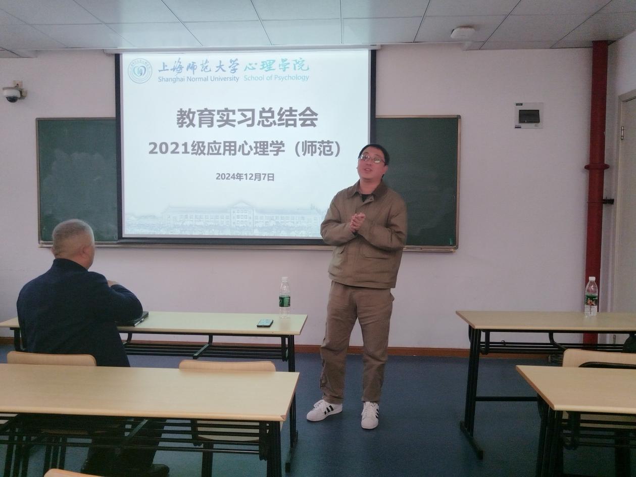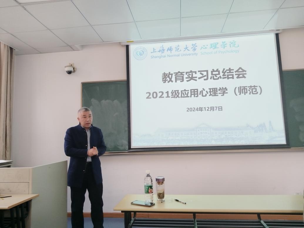 丁雪辰主任在发言中高度赞扬了同学们在实习中的成长和收获,认可同学们在心理健康教育课程设计、教学、个体/团体辅导等工作中的专业表现。丁雪辰老师认为心理学院首届师范生的教育实习经验非常宝贵,提出以后可以请低年级的学生一起参加教育实习总结会,减少信息差,增加沟通交流。