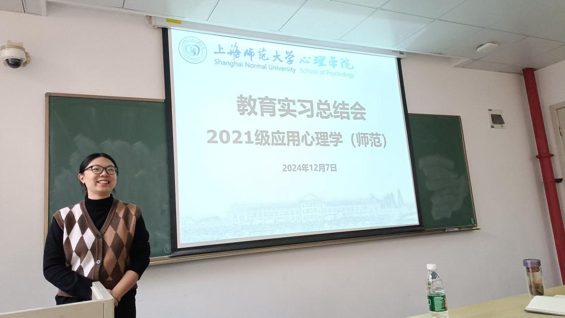 在师范生结束为期三个月的集中实习后,心理学院在2024年12月7日举办了第一届师范生的教育实习总结会,会议由黄婉怡老师主持。陈宁副院长和丁雪辰系主任出席本次会议。25名师范生逐一进行了实习汇报,分享了自己在实习阶段的工作内容和任务完成情况,总结了自己的实习经验和感受,并展现了各项实习成果。