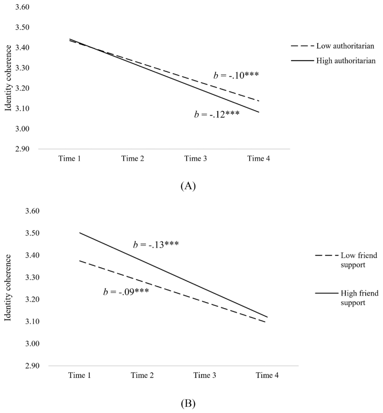 多指标潜在增长曲线模型(MI-LGCM)结果表明:(1)个体认同统合(Identity Coherence)在初中阶段(6-9年级)呈线性下降趋势;个体认同混淆(Identity Confusion)则呈现先上升后下降的二次曲线模式(倒U型曲线;6-8年级上升,8-9年级下降)。(2)专制型教养方式与同伴支持对个体认同统合下降速率具有调节作用。