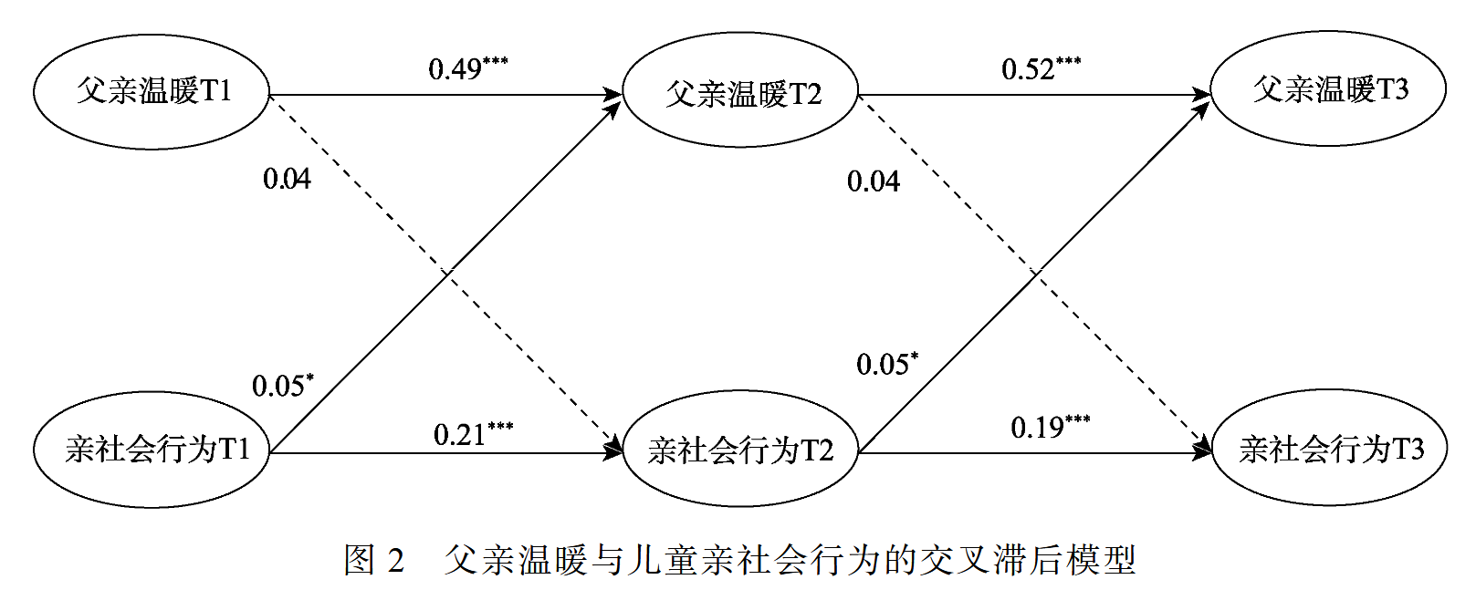 潜变量交叉滞后模型分析结果表明,父母温暖与儿童亲社会行为的直接预测关系因父母角色有所不同。母亲温暖正向预测儿童亲社会行为,而儿童亲社会行为正向预测父亲温暖。