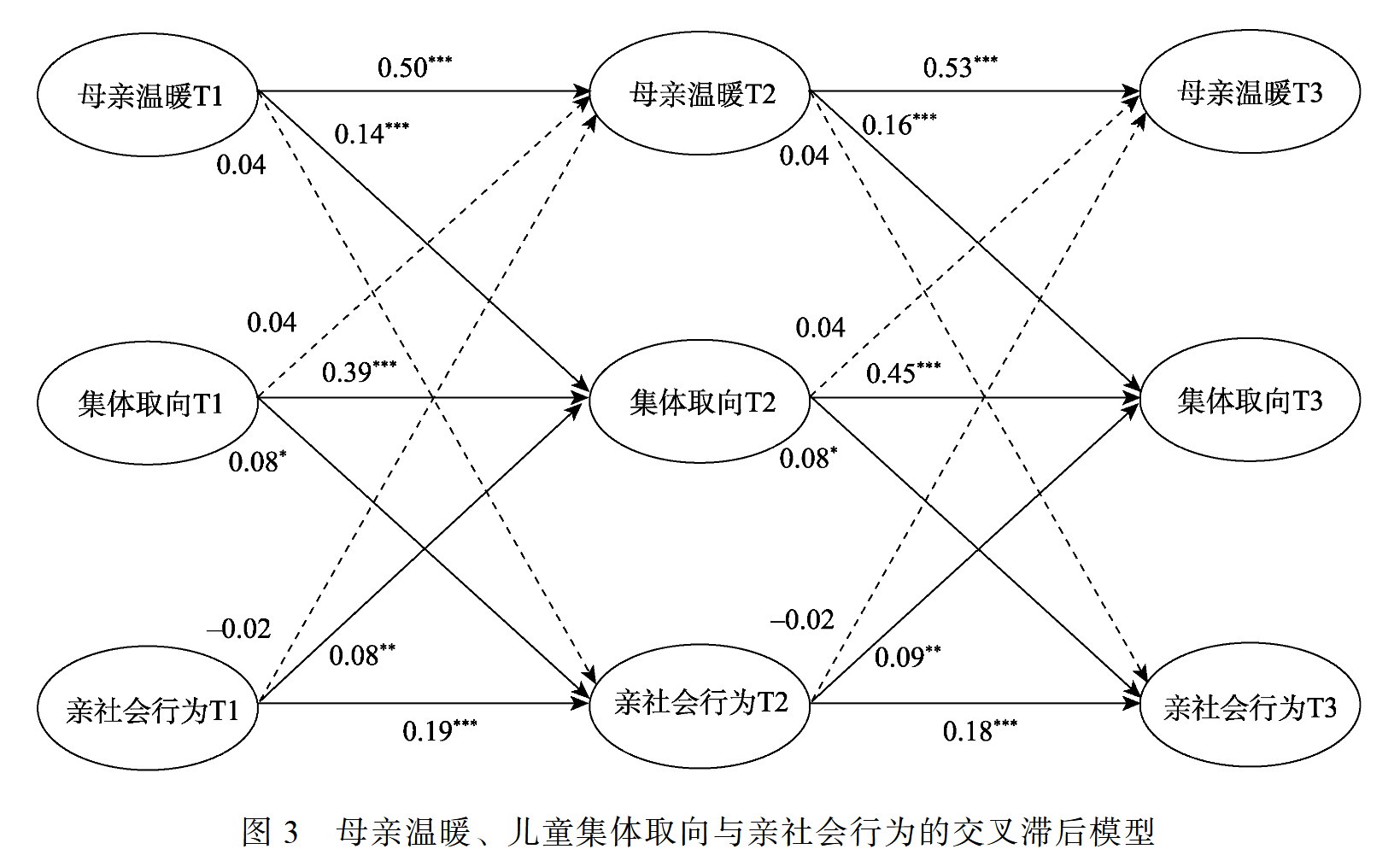 儿童集体取向是父母温暖影响儿童亲社会行为的中介桥梁。T1(第一次测量)的父亲温暖和母亲温暖,都可以通过 T2(第二次测量)的儿童集体取向,进而影响 T3(第三次测量)的儿童亲社会行为。