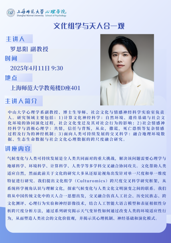 2025年4月11日上午9:30,中山大学心理学系副教授、博士生导师罗思阳应邀在太阳成集团tyc33455心理学院教苑楼D座401室举办题为《文化组学与天人合一观》的学术讲座。本次讲座聚焦气候变化与人类可持续发展的重大议题,吸引了校内外师生及跨学科学者的广泛关注。