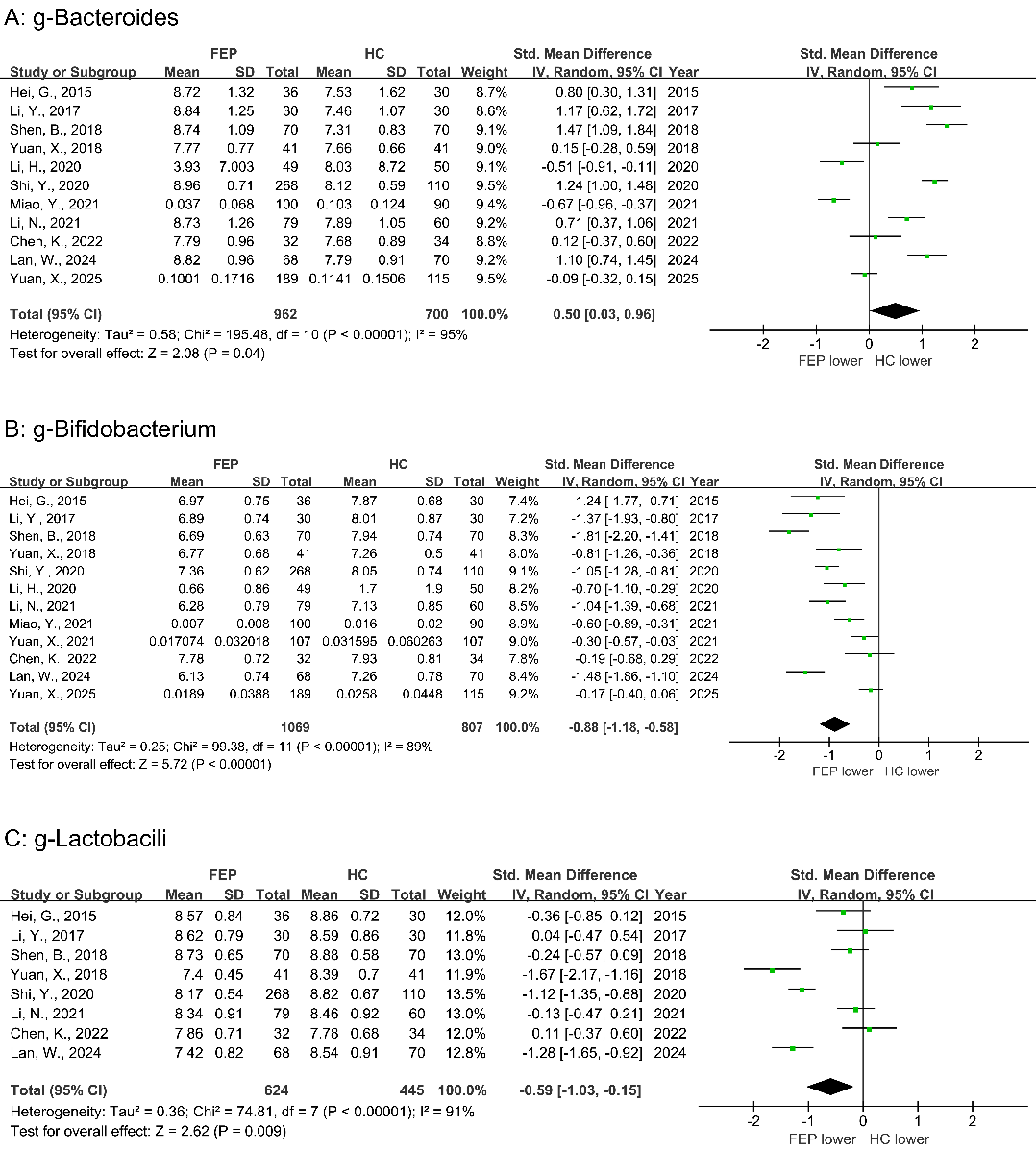 图1. Forest plots of the estimated relative abundance of genus-Bacteroidetes, genus-Bifidobacterium, and genus-Lactobacilli in FEP compared to HC. Notes: FEP, first episode psychosis; HC, healthy control.