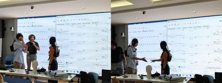 工程师首先介绍了近红外超扫描技术在教育场景中的应用实践,包括师生互动、亲子关系等研究范式。随后,现场演示了便携式近红外设备在自然互动环境中的无线数据采集流程以及无线标记方法。