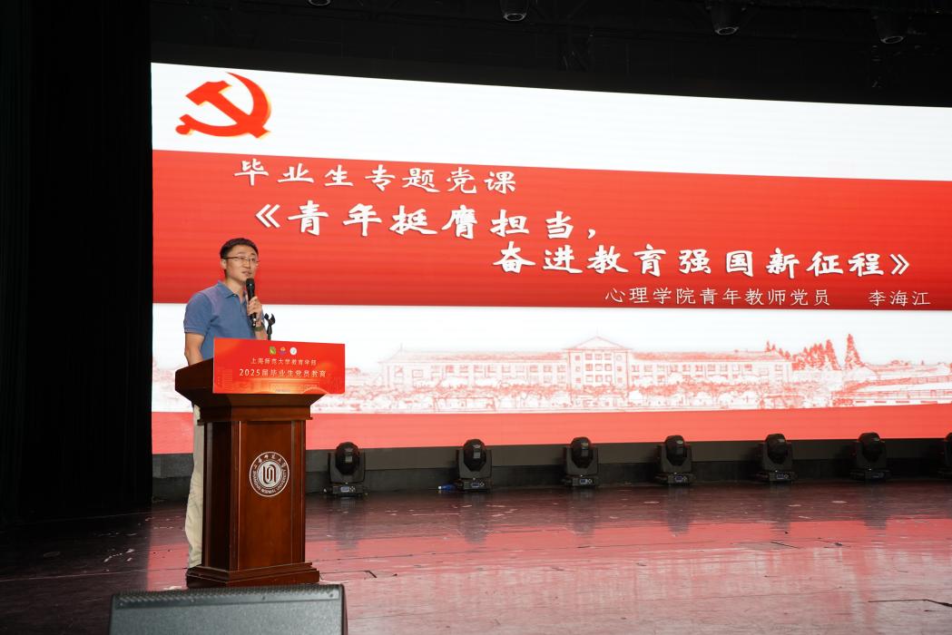 青年党员教师李海江副教授开展“青年挺膺担当,奋进教育强国新征程”主题党课教育,教育引导毕业生党员要深入学习贯彻习近平总书记关于加强党的作风建设的重要论述,希望同学们坚守初心、提升素养、全面发展、成为榜样力量和青春楷模。