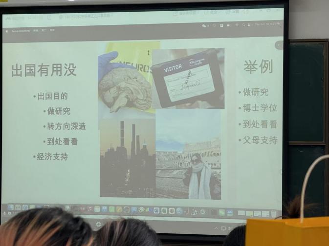 李静雯目前于纽约州立大学石溪分校心理学系Cognitive Health and Neurodegeneration Lab任全职实验室经理与协调员一职,研究方向为基于脑成像分析的临床精神病理学研究,在我校本科毕业后,在哥伦比亚大学神经科学与教育专业完成硕士学业。李静雯通过在线方式分享了她的留学心路历程。她既分享了在哥伦比亚大学接触前沿研究(如福尔马林人脑标本)的震撼体验,也坦诚面对了文化冲击带来的挑战,例如适应不同文化背景同学的协作风格,以及应对授课模式差异所需的更主动学习态度。她特别提醒学弟学妹:“留学并非简单的‘镀金’,真正价值在于“成为有社会责任感的研究者”。