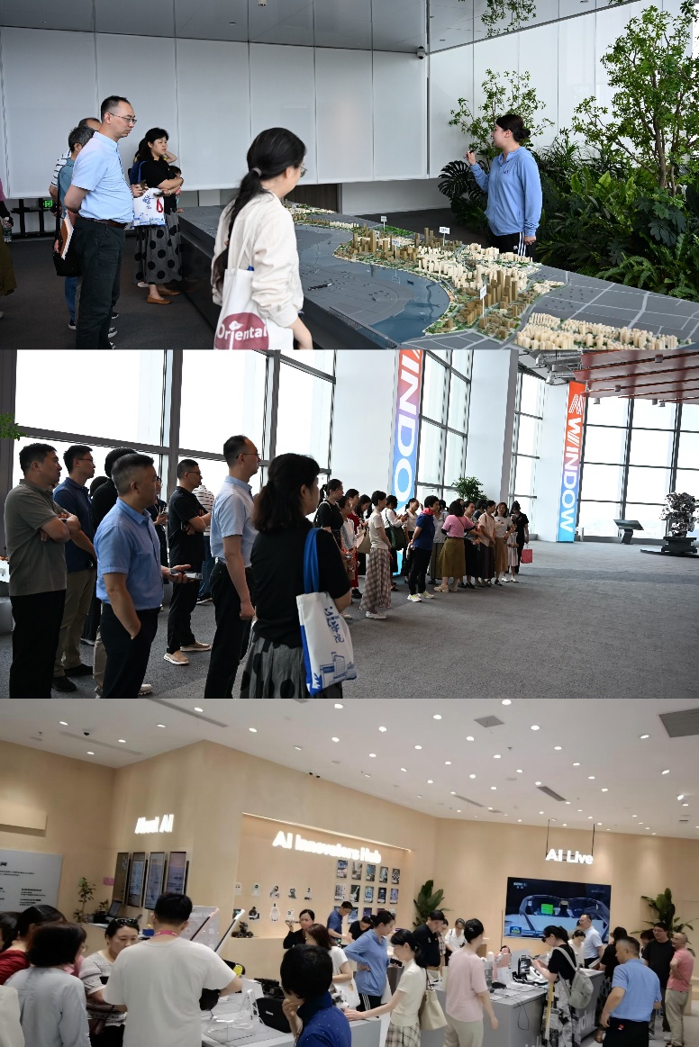 在西岸智塔45层的徐汇滨江规划展示中心,老师们通过全景沙盘、数字影像、高处俯瞰,深入了解徐汇滨江的转型故事与人工智能的革新力量。西岸智慧谷、传媒港、数字谷的蓝图跃然眼前,人工智能与艺术、生态的深度融合让老师们赞叹不已。智塔作为城市科技创新的高地,塔内聚集了多家高科技企业和研究机构,涵盖了人工智能、大数据、云计算等多个领域,汇聚了众多前沿科技企业和创新人才。老师们不仅直观地领略到了上海西岸集生态、智能、科技、文化等方面融合发展的美好前景,更感受到了城市发展、治理、更新所取得的显著成效。